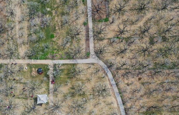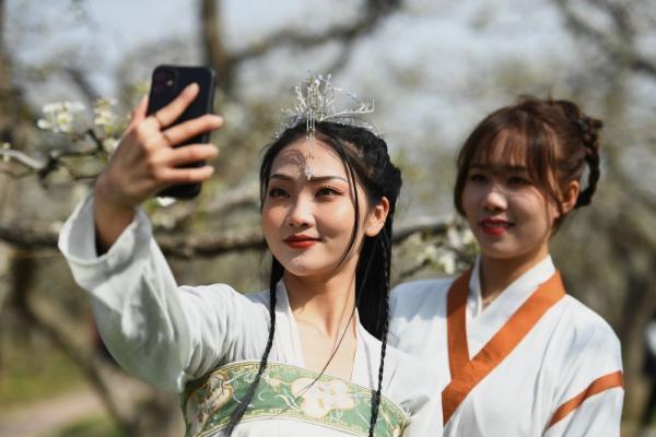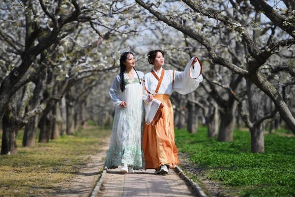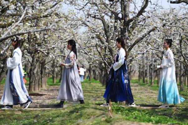 3月25日,游客在河南省商丘市宁陵县万亩生态梨园内游玩。