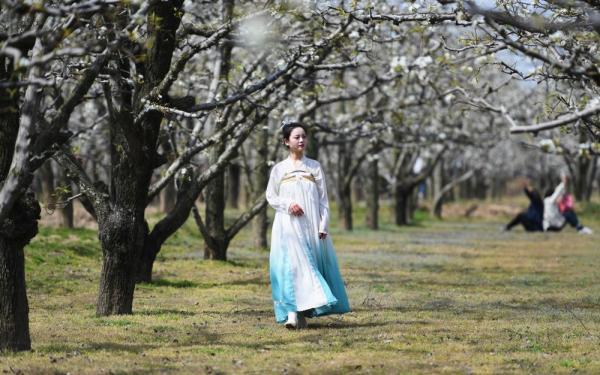 近日随着气温回升,河南省商丘市宁陵县的梨花相继盛开,吸引不少游客前来观赏。