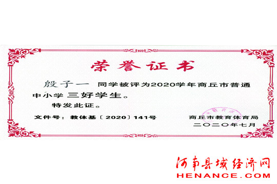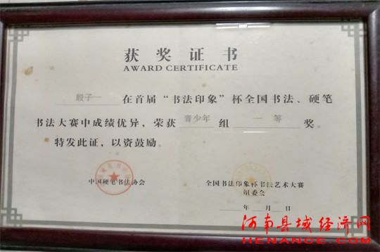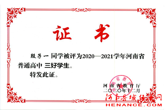 在河南省宁陵县高级中学高三B00班的一名学生叫殷子一,从小学到中学,他时刻记得把“板凳要坐十年冷,一朝圆梦进北大”作为恪守的信条,寒窗苦读,孜孜不倦。他在多次联考中名列前茅,曾获得全国高中数学联赛三等奖,化学奥赛河南省预赛一等奖,全国硬笔书法大赛青少年组一等奖,商丘市“三好学生”、商丘市“文明学生”,河南省“三好学生”等一系列荣誉称号。